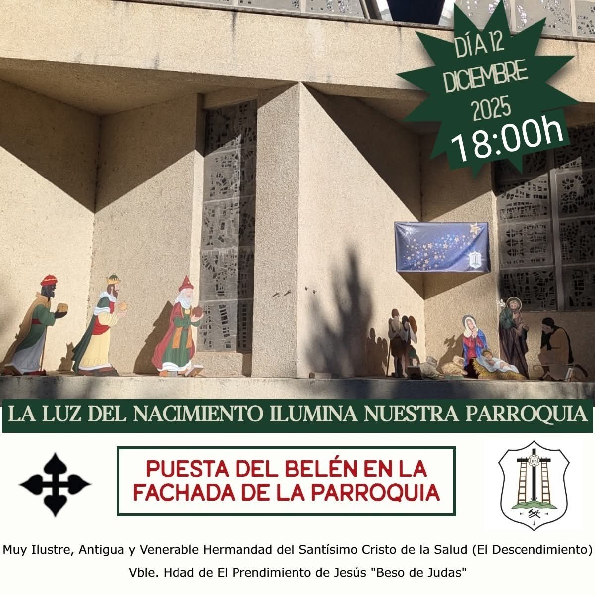 06/12/2025 El viernes, 12 de diciembre, nos uniremos a @ElPrendimientoC para inaugurar la Navidad con la puesta del Belén en la fachada de nuestra parroquia. Un momento especial para recordar el verdadero significado de la Navidad: el nacimiento de Jesús, símbolo de amor, esperanza y paz. https://t.co/JjqHQDfcnf